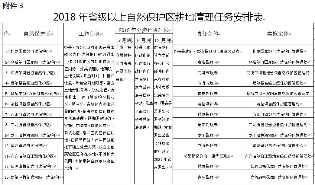2.大力開展自然保護區(qū)內毀濕開墾問題整改。認真貫徹落實省林業(yè)廳《黑龍江省地方林業(yè)自然保護區(qū)內毀濕(林、草)開墾問題整改工作方案》要求,組織開展本轄區(qū)內自然保護區(qū)耕地退出工作,對保護區(qū)內耕地按照三區(qū)劃分,分類梳理耕地面積、土地權屬、開墾時間、種植戶信息、承包合同期限等,建立土地臺賬清單,完成保護區(qū)內耕地退出基礎工作。對自然保護區(qū)成立前核心區(qū)和緩沖區(qū)內已存在的耕地分類提出解決方案,明確退耕還濕期限,依法依規(guī)做好保護區(qū)內耕地有序退出工作。對自然保護區(qū)成立后發(fā)生的違法、違規(guī)毀濕(林、草)開墾問題,全面停止耕種并依法打擊處理。此項工作2018年底前完成。(責任單位:訥河市政府、龍江縣政府、富??h政府、泰來縣政府、拜泉縣政府、克山縣政府、克東縣政府、依安縣政府、甘南縣政府、昂昂溪區(qū)政府、梅里斯區(qū)政府、鐵鋒區(qū)政府、建華區(qū)政府、扎龍國家級自然保護區(qū)管理局、省農墾總局九三管理局)