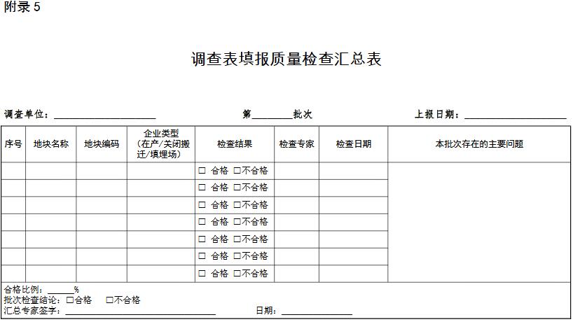 省級和市級質(zhì)控單位結(jié)合本地信息采集工作的組織實施模式,建立信息采集質(zhì)控工作機制,組建外審質(zhì)控專家隊伍,制定質(zhì)控工作計劃;結(jié)合信息采集工作進展同步啟動質(zhì)控工作,分批次對調(diào)查單位內(nèi)審?fù)ㄟ^后提交的調(diào)查表進行檢查,各級質(zhì)控單位可同步開展外審工作。省級和市級質(zhì)控單位分別隨機開展外審檢查工作,對每家調(diào)查單位已完成調(diào)查表的檢查比例不低于 20%,適當(dāng)加大對在產(chǎn)企業(yè)用地調(diào)查表的檢查比例。每個調(diào)查表外審?fù)瓿珊筇顚懻{(diào)查表填報質(zhì)量檢查表(附錄 3),對不符合項應(yīng)進行標(biāo)注,對檢查不合格的調(diào)查表應(yīng)出具調(diào)查表整改意見單(附錄 4)。在一個批次調(diào)查表的外審工作完成后,質(zhì)控單位應(yīng)填寫調(diào)查表填報質(zhì)量檢查匯總表(附錄 5),出具該批次外審意見。
