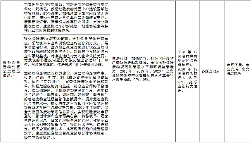 (四)嚴(yán)格環(huán)境監(jiān)管。創(chuàng)新監(jiān)管手段,健全監(jiān)管模式,實施最嚴(yán)格的全過程環(huán)境監(jiān)管措施,嚴(yán)防危險廢物非法轉(zhuǎn)移、處置。嚴(yán)格執(zhí)行危險廢物申報登記、轉(zhuǎn)移聯(lián)單、經(jīng)營許可制度,進(jìn)一步加強危險廢物規(guī)范化管理。強化危險廢物跨區(qū)域轉(zhuǎn)移監(jiān)管,嚴(yán)格把控危險廢物跨省市處置。持續(xù)開展危險廢物規(guī)范化管理督查考核,定期公布結(jié)果,促進(jìn)環(huán)境監(jiān)管水平不斷提高。加強環(huán)保、公安、交通、安監(jiān)、衛(wèi)生等相關(guān)部門的聯(lián)勤聯(lián)動,嚴(yán)厲打擊危險廢物非法排放、轉(zhuǎn)移、傾倒、處置等環(huán)境違法犯罪行為,建立聯(lián)合打擊危險廢物犯罪長效機(jī)制。