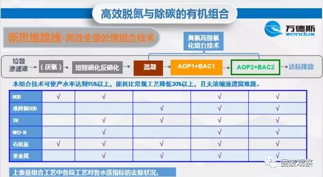 南京萬德斯環(huán)??萍脊煞萦邢薰旧虾7止究偨?jīng)理陳建湧介紹,在滲瀝液脫碳技術上,萬德斯環(huán)保采用“厭氧+高效生化+納濾+臭氧高級氧化AOP(Advanced Oxidation Process)” 為主的工藝,在高效脫氮中,利用短程硝化技術,節(jié)省供氧量25%、節(jié)省反硝化碳源40%、減少污泥生成量50%、減少投堿量、縮短反應時間。在滲瀝液高效全量處理中,組合利用 “厭氧+短程硝化反硝化+臭氧高級氧化(混凝+AOP1+BAC1+AOP2+BAC2)”技術,能使產(chǎn)水率達到95%以上,且無濃縮液遺留難題。除技術創(chuàng)新外,陳建湧總經(jīng)理認為,提倡垃圾干濕分類,采取各種有效措施減少各種好水分包括雨水進入垃圾,以及垃圾堆場等,對降低滲瀝液處理成本具有非常重要的意義。