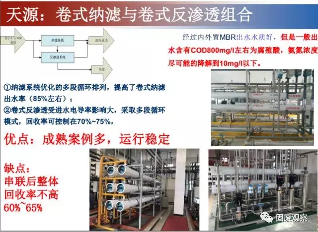 在天源環(huán)保預處理系統(tǒng)中,進入調(diào)節(jié)池前首先經(jīng)過專用纖維處理器,減少毛發(fā)、固體顆粒等來減少污泥沉積;厭氧工藝中,研發(fā)了高效外盤管循環(huán)厭氧UASB反應器,專適用于焚燒廠水質(zhì)的UASB厭氧工藝,提升厭氧效率,對COD的降解達到90%以上;MBR系統(tǒng)方面,天源環(huán)保的研究更為深入,主編了國家垃圾滲濾液MBR的標準:《生活垃圾滲濾液膜生物反應系統(tǒng)技術規(guī)程》 CJJ/T 264-2016。MBR系統(tǒng)是生化系統(tǒng)和超濾膜系統(tǒng)的有機結合,生化系統(tǒng)采用兩級A/O處理工藝,確保對氨氮和COD的去除率高,超濾“出水達量”。