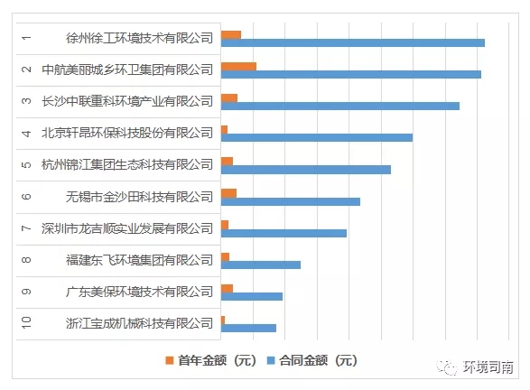 其中:“徐州徐工環(huán)境技術(shù)有限公司、中航美麗城鄉(xiāng)環(huán)衛(wèi)集團有限公司、長沙中聯(lián)重科環(huán)境產(chǎn)業(yè)有限公司、杭州錦江集團生態(tài)科技有限公司、深圳市龍吉順實業(yè)發(fā)展有限公司”等10家公司共中標17個項目,合同總金額49.53億元,中標項目首年服務(wù)費總金額4.34億元。