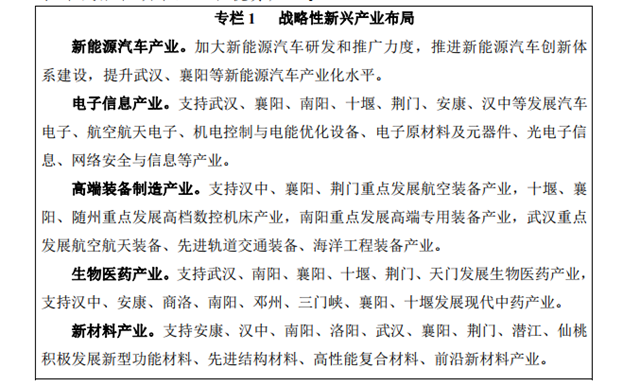 發(fā)揮武漢、襄陽(yáng)、十堰、荊門(mén)、南陽(yáng)、漢中等地創(chuàng)新資源優(yōu)勢(shì), 積極培育新能源汽車、電子信息、高端裝備制造、生物醫(yī)藥、新材 料等產(chǎn)業(yè),打造一批新興產(chǎn)業(yè)基地。加強(qiáng)軍民融合創(chuàng)新示范,推進(jìn) 軍民資源共享和軍民兩用技術(shù)雙向轉(zhuǎn)移轉(zhuǎn)化,著力推進(jìn)海工裝備、 激光、北斗導(dǎo)航、新型航天等一批重點(diǎn)項(xiàng)目集聚發(fā)展,培育壯大一 批軍民融合領(lǐng)軍企業(yè)和優(yōu)勢(shì)產(chǎn)業(yè)。