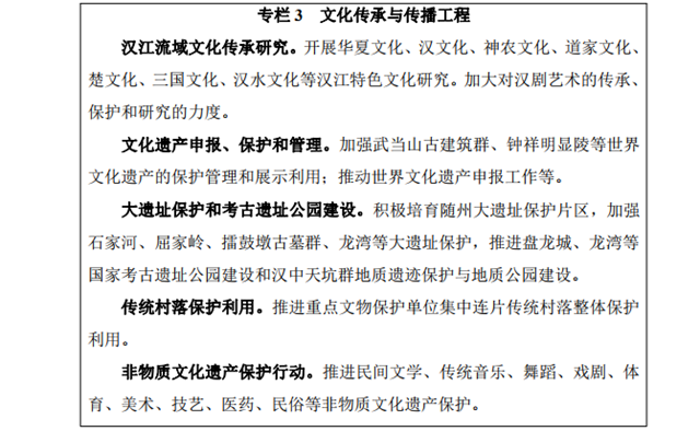 加強(qiáng)文化傳承與傳播。開(kāi)展文化遺產(chǎn)的調(diào)查,建立漢江歷史文 化遺產(chǎn)保護(hù)傳承數(shù)據(jù)庫(kù),做好世界文化遺產(chǎn)的申報(bào)、保護(hù)與管理, 推進(jìn)大遺址保護(hù)和考古遺址公園建設(shè),對(duì)丹江口庫(kù)區(qū)淹沒(méi)區(qū)瀕危文 物實(shí)施搶救保護(hù)。加強(qiáng)歷史文化名城、名鎮(zhèn)、名村的保護(hù),有條件 的地區(qū)實(shí)行連片保護(hù)和適度開(kāi)發(fā)。推進(jìn)革命文物和水下文化遺產(chǎn)保 護(hù)。加強(qiáng)非物質(zhì)文化遺產(chǎn)的挖掘與保護(hù),深入開(kāi)展傳統(tǒng)文化研究, 挖掘優(yōu)秀傳統(tǒng)文化的歷史淵源、時(shí)代內(nèi)涵和現(xiàn)實(shí)價(jià)值。聯(lián)合開(kāi)展?jié)h 江文化旅游節(jié)等特色節(jié)慶活動(dòng),打造文化活動(dòng)品牌。