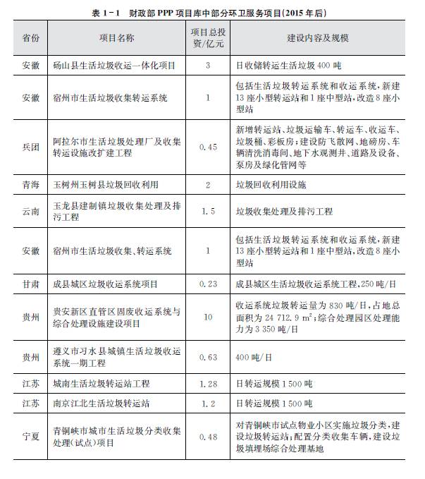 2015年開始,PPP模式在各地公用市政行業(yè)全面展開,業(yè)內(nèi)人士稱之為PPP元年。伴隨整個(gè)市場(chǎng)大環(huán)境,環(huán)衛(wèi)服務(wù)行業(yè)的市場(chǎng)化也已經(jīng)大幕開啟,越來越多的環(huán)衛(wèi)領(lǐng)域的項(xiàng)目開始公開招標(biāo)。各地開始出現(xiàn)一些分包作業(yè)或者環(huán)衛(wèi)一體化PPP項(xiàng)目,包含垃圾清運(yùn)、道路清掃、設(shè)施維護(hù)等環(huán)衛(wèi)作業(yè)內(nèi)容,或打包招標(biāo)。較為典型的是2015年??谑协h(huán)衛(wèi)一體化建設(shè)全面引入PPP模式項(xiàng)目,4個(gè)區(qū)分別由北京環(huán)衛(wèi)集團(tuán)、龍馬環(huán)衛(wèi)和深圳玉禾田公司中標(biāo)。2015年財(cái)政部建立的PPP項(xiàng)目庫中首次出現(xiàn)了17個(gè)環(huán)衛(wèi)項(xiàng)目,總規(guī)模約42億元,主要以垃圾清運(yùn)項(xiàng)目為主。截至目前通過2015年財(cái)政部建立的PPP項(xiàng)目庫檢索生活垃圾相關(guān)的PPP項(xiàng)目,有多達(dá)202條項(xiàng)目記錄,包含生活垃圾清運(yùn)、轉(zhuǎn)運(yùn)、分揀、終端處理設(shè)施新建和改擴(kuò)建等項(xiàng)目。