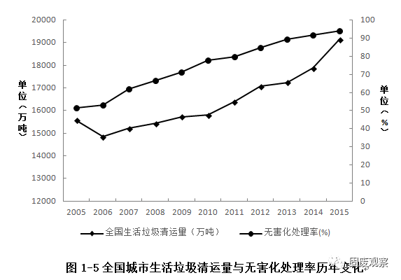 2015年全國(guó)城市共清運(yùn)生活垃圾19141.87萬噸,比2014年增加7.18%,清運(yùn)量較以往增速非常明顯。2015年生活垃圾無害化處理率已達(dá)到94.10%,較2014年91.79%繼續(xù)提升了2.31%,表明生活垃圾采用簡(jiǎn)易處理方式的情況將會(huì)越來越少。