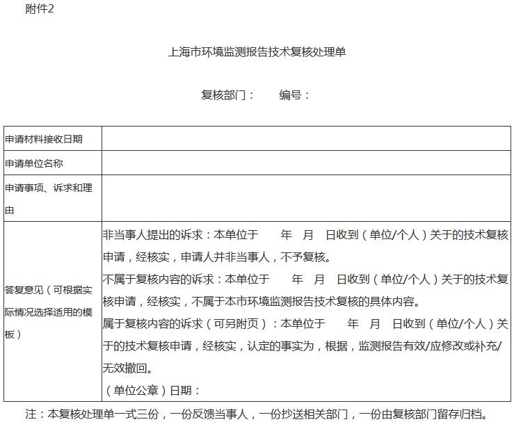 復(fù)核部門應(yīng)當在收到復(fù)核申請材料后20個工作日內(nèi)完成復(fù)核并出具意見,填寫《上海市環(huán)境監(jiān)測報告技術(shù)復(fù)核處理單》(附件2)并加蓋單位公章后書面反饋當事人。