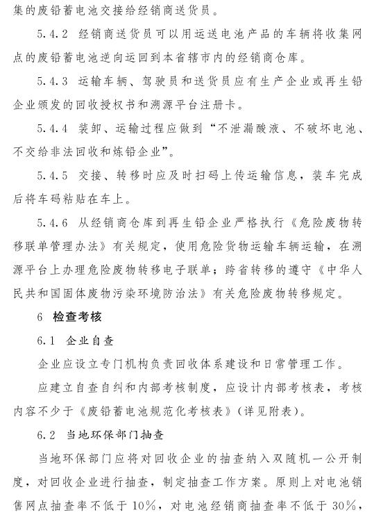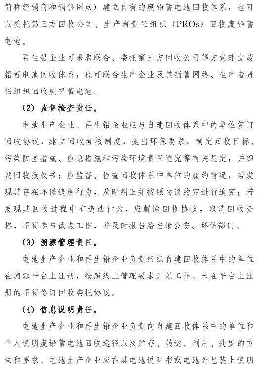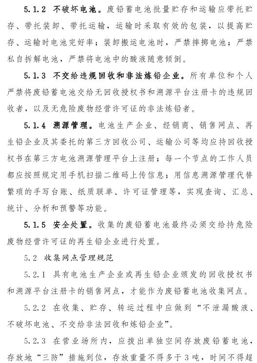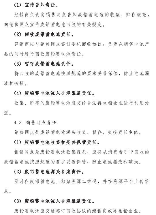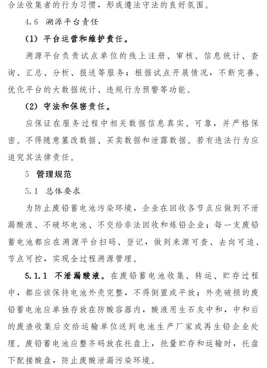 推動(dòng)落實(shí)生產(chǎn)者責(zé)任延伸制度,由鉛蓄電池生產(chǎn)企業(yè)依托自有銷售渠道建立廢鉛蓄電池逆向物流回收體系,持危險(xiǎn)廢物經(jīng)營(yíng)許可證的再生鉛企業(yè)可通過(guò)自主回收、聯(lián)合回收或委托回收等方式建立回收體系。鼓勵(lì)生產(chǎn)企業(yè)和持證企業(yè)進(jìn)行信息溝通和密切合作,以市場(chǎng)為導(dǎo)向,建立穩(wěn)定的商業(yè)交易模式,并采取以舊換新等措施,不斷提高收集處理率。各回收體系收集的廢鉛蓄電池最終須交由具有危險(xiǎn)廢物經(jīng)營(yíng)許可證的再生鉛企業(yè)利用處置。制定 《廢鉛蓄電池規(guī)范化管理指南》,明確回收體系中各環(huán)節(jié)、各責(zé)任主體責(zé)任及廢鉛蓄電池管理規(guī)范。參與廢鉛蓄電池回收的各責(zé)任主體須嚴(yán)格遵守 《廢鉛蓄電池規(guī)范化管理指南》的各項(xiàng)規(guī)定。