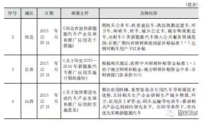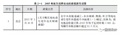 2015年,北京、河北、長春、山西等地陸續(xù)出臺了相關新能源車政策,紛紛響應中央標準1:1配套補助新能源環(huán)衛(wèi)車,如表2-1所示。