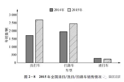2015年,我國合計完成清掃車、洗掃車、掃路車銷售5386輛,同比增長36.01%。細分市場,洗掃車和掃路車累計銷量同比均實現(xiàn)增長,分別達到2700輛和2459輛,同比增幅分別在56%和25%以上,在2015年全國清掃/洗掃/掃路車總銷量中的占有率分別在50%和45%以上,同比分別增長6%和下降3%以上。