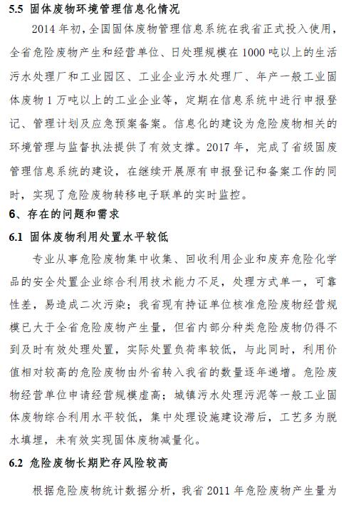 固體廢物污染防治是環(huán)境保護(hù)工作的重要組成部分,尤其是危險(xiǎn)廢物(含醫(yī)療廢物),因其含有有毒有害成分,若利用和處置不當(dāng),將對(duì)水體、大氣和土壤造成嚴(yán)重污染,甚至威脅人民群眾身心健康。妥善利用、處置固體廢物是防范環(huán)境風(fēng)險(xiǎn)的重要措施之一,是整體改善水、大氣和土壤環(huán)境質(zhì)量的重要保障?!笆濉逼陂g,按照《危險(xiǎn)廢物“十二五”污染防治規(guī)劃》要求,查清了全省固體廢物的現(xiàn)狀,對(duì)全省危險(xiǎn)廢物產(chǎn)生單位實(shí)施分級(jí)、標(biāo)準(zhǔn)化管理,危險(xiǎn)廢物規(guī)范化管理和經(jīng)營水平不斷提高。