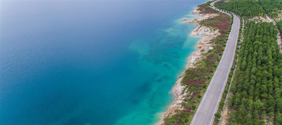 在位于廣東茂名市區(qū)西北角的露天礦,60多歲的退休市民陳阿姨站在一座歐式小木屋下乘涼。眼前是一片寬闊清澈的湖水,湖的兩岸樹木蔥蘢、綠草茵茵。而在四年前,這里還是一個(gè)被廢棄的油頁(yè)巖大礦坑,垃圾遍地、污水橫流,被當(dāng)?shù)厝送葱牡胤Q為這座城市的“傷疤”。這是茂名露天礦生態(tài)公園中的湖邊公路(8月17日攝)。上圖:...