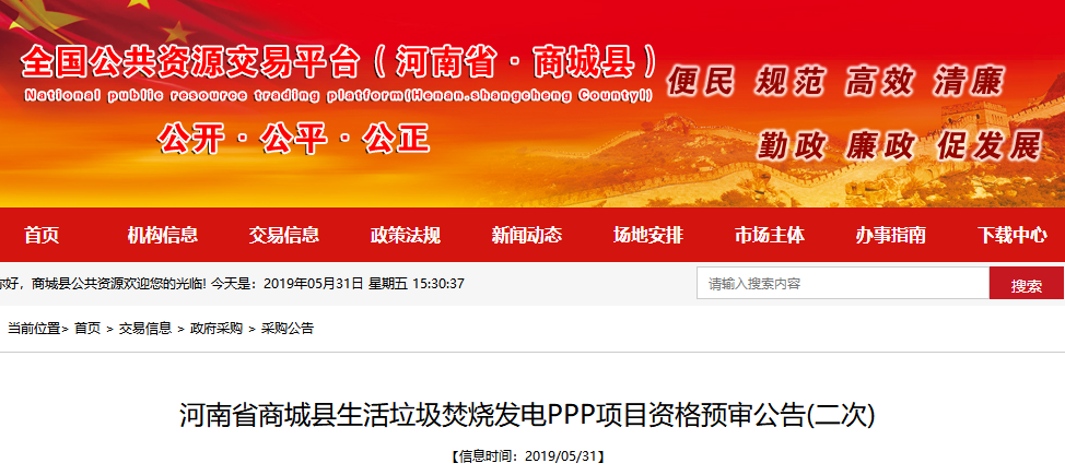 中國環(huán)聯(lián)網(wǎng)獲悉,5月31日,河南省商城縣生活垃圾焚燒發(fā)電PPP項(xiàng)目發(fā)布資格預(yù)審公告(二次)。項(xiàng)目概況及采購內(nèi)容項(xiàng)目名稱:河南省商城縣生活垃圾焚燒發(fā)電PPP項(xiàng)目;采購編號(hào):商財(cái)采招字(2018)-147號(hào);采購方式:公開招標(biāo) ;建設(shè)內(nèi)容:建設(shè)一座生活垃圾焚燒發(fā)電,一期工程規(guī)模600噸/日,配套一期工程...