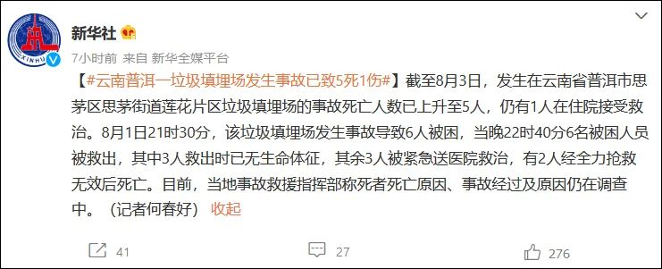 8月1日普洱市思茅區(qū)蓮花片區(qū)垃圾填埋場發(fā)生事故致6人被困目前事故死亡人數(shù)已上升至5人# 事件經(jīng)過 #8月1日21時30分,普洱市思茅區(qū)相關部門接到報警,思茅街道蓮花片區(qū)垃圾填埋場有人被困。事故發(fā)生后,市委、市政府和思茅區(qū)委、區(qū)政府高度重視,市區(qū)兩級迅速成立“8.01”事故救援指揮部進行現(xiàn)場緊急救援。...