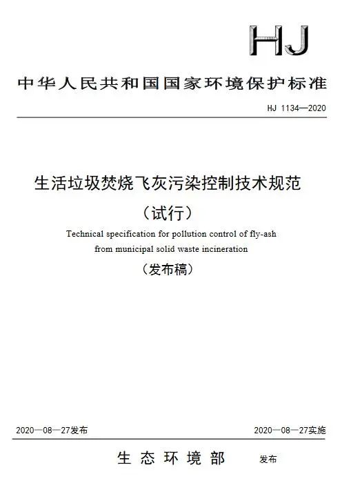 生活垃圾焚燒飛灰污染控制技術(shù)規(guī)范(試行)(HJ 1134—2020)