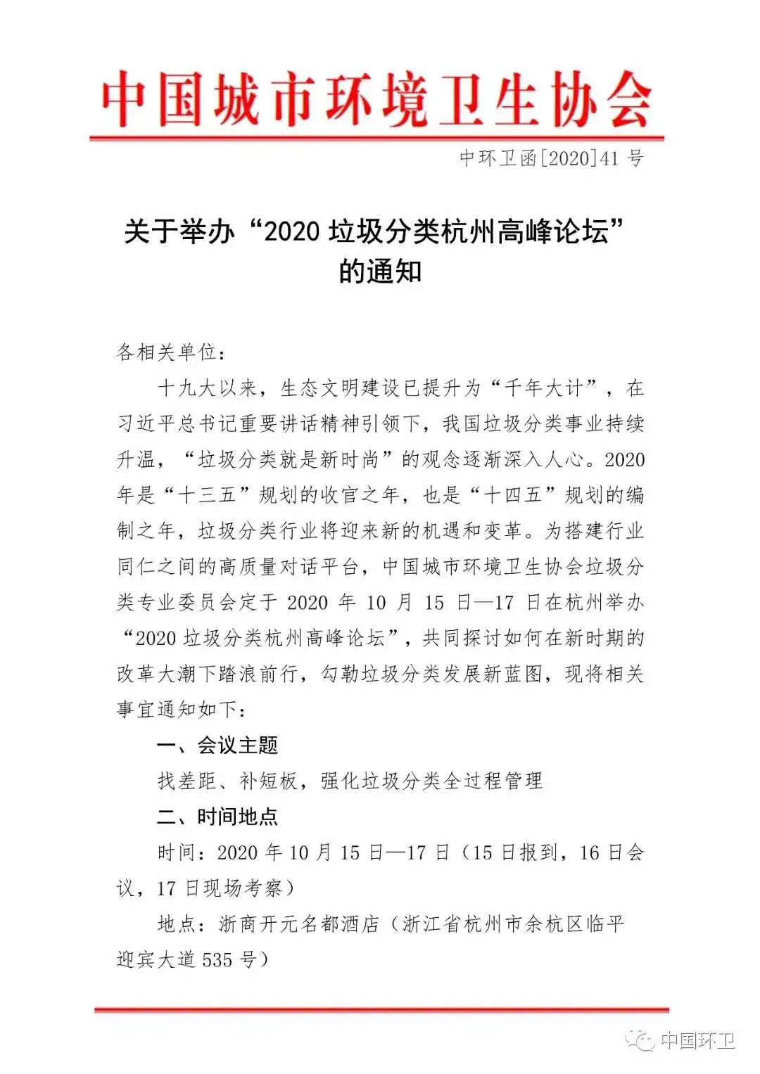 關(guān)于舉辦“2020垃圾分類杭州高峰論壇”的通知