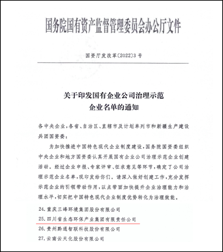 國(guó)企改革顯成效 公司治理見(jiàn)真章 四川生態(tài)環(huán)保集團(tuán)獲評(píng)國(guó)務(wù)院國(guó)資委“國(guó)有企業(yè)公司治理示范企業(yè)” 近日,國(guó)務(wù)院國(guó)資委正式發(fā)布“國(guó)有企業(yè)公司治理示范企業(yè)”名單,四川省生態(tài)環(huán)保產(chǎn)業(yè)集團(tuán)有限責(zé)任公司(以下簡(jiǎn)稱“四川生態(tài)環(huán)保集團(tuán)”)成功入選...