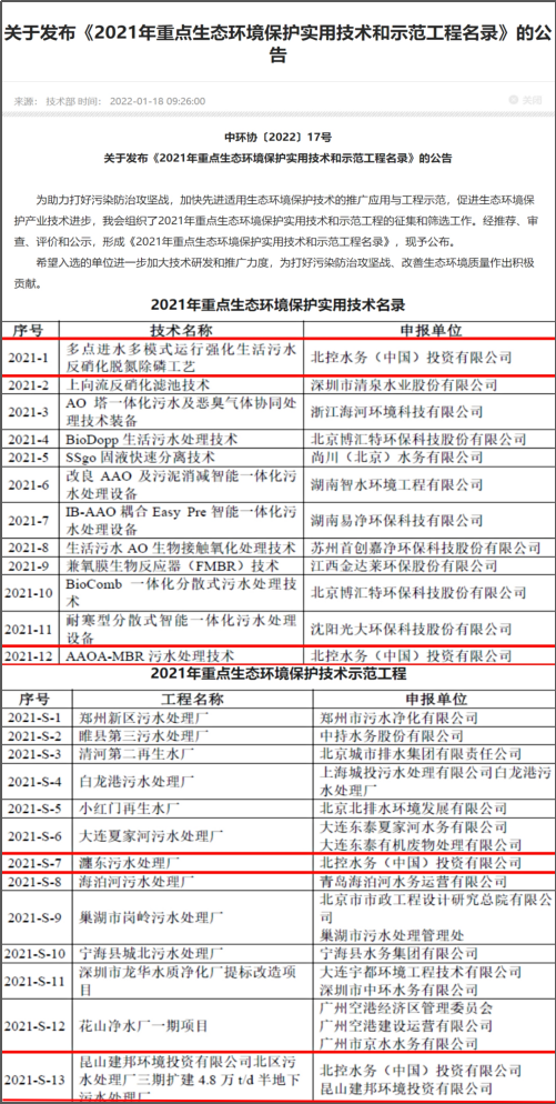 近日,中國環(huán)境保護(hù)產(chǎn)業(yè)協(xié)會公布了《2021年重點(diǎn)生態(tài)環(huán)境保護(hù)實(shí)用技術(shù)和示范工程名錄》, 北控水務(wù)申報(bào)的兩項(xiàng)技術(shù)、兩項(xiàng)工程成功上榜,分別入選“實(shí)用技術(shù)名錄”及“示范工程名錄”,彰顯了北控水務(wù)專業(yè)的技術(shù)能力和運(yùn)營實(shí)力。 兩項(xiàng)實(shí)用技術(shù)上榜 技術(shù)專業(yè)創(chuàng)新能力獲...
