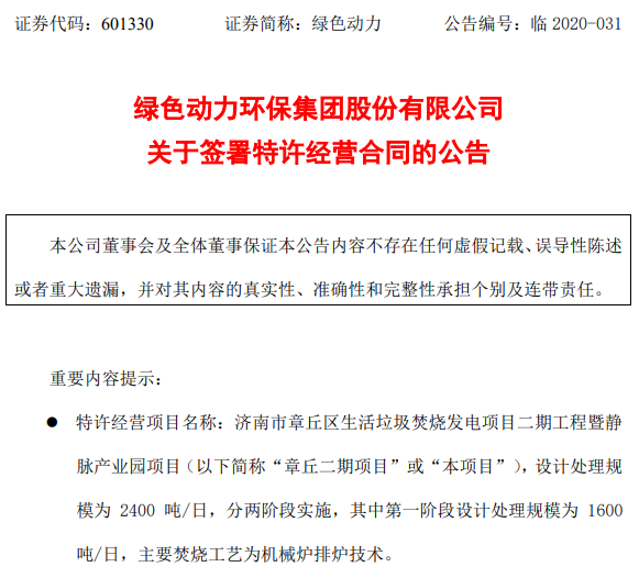 綠色動(dòng)力環(huán)保6月3日公布一則關(guān)于簽署特許經(jīng)營合同的公告,公告顯示綠色動(dòng)力與濟(jì)南市章丘區(qū)環(huán)境衛(wèi)生管護(hù)中心簽署《章丘區(qū)生活垃圾焚燒發(fā)電項(xiàng)目二期工程暨靜脈產(chǎn)業(yè)園項(xiàng)目特許經(jīng)營協(xié)議》,項(xiàng)目總投資約15億元(人民幣。下同),第一階段總投資約8.5億元,其中資本金約2.55億元。 綠色動(dòng)力環(huán)保集團(tuán)指出,該項(xiàng)目采用...