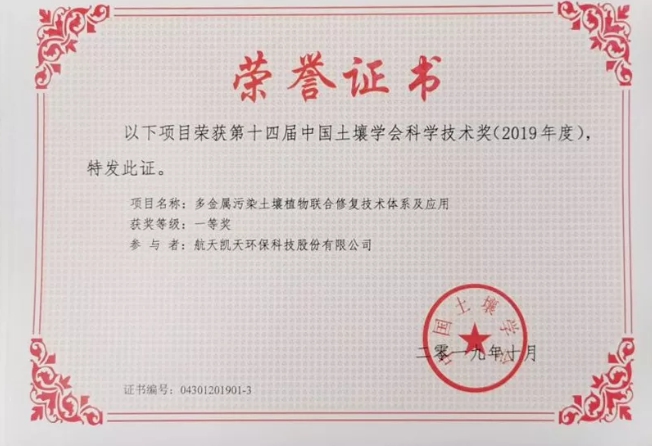 2019年10月,經(jīng)中國土壤學(xué)會(huì)項(xiàng)目評(píng)選委員會(huì)評(píng)審決定,航天凱天環(huán)??萍脊煞萦邢薰九c中山大學(xué)、廣東省耕地肥料總站聯(lián)合申報(bào)的“多金屬污染土壤植物聯(lián)合修復(fù)技術(shù)體系及應(yīng)用”獲中國土壤學(xué)會(huì)科學(xué)技術(shù)獎(jiǎng)一等獎(jiǎng)。 該技術(shù)體系將航天凱天環(huán)保自主研發(fā)的重金屬土壤修復(fù)技與中山大學(xué)研發(fā)的多金屬污...