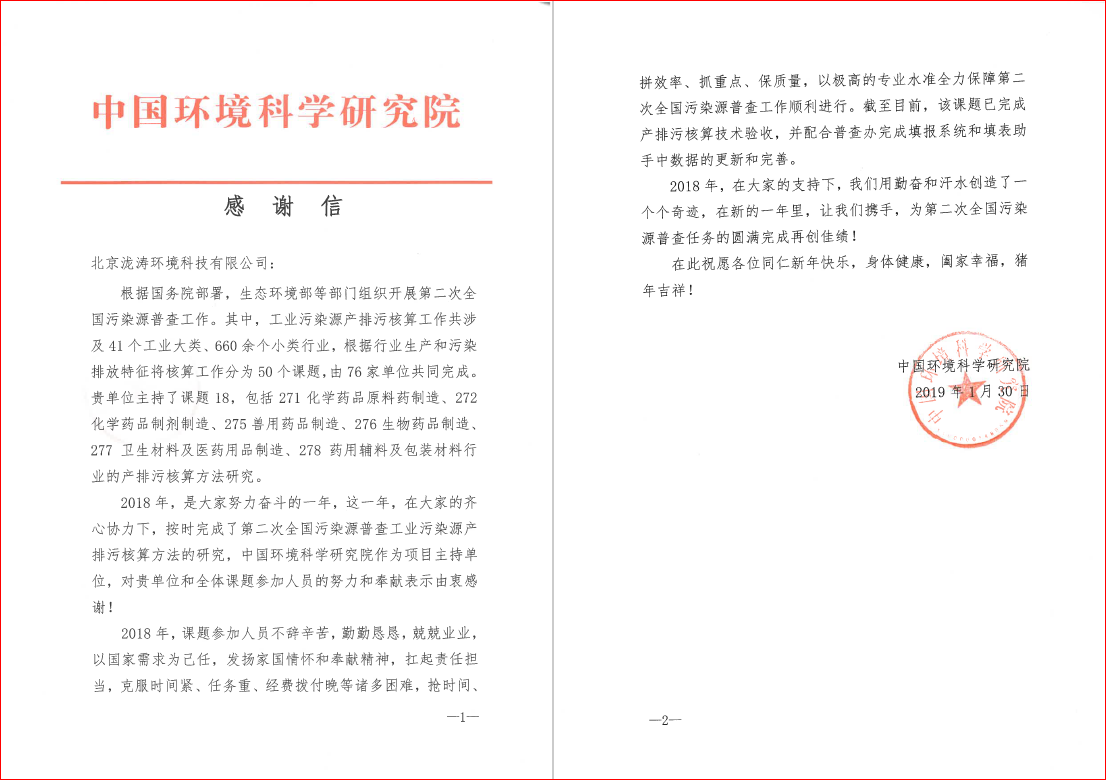 近日,北京瀧濤環(huán)境科技有限公司(“瀧濤環(huán)境”)收到了一封來自中國環(huán)境科學(xué)研究院(“環(huán)科院”)的感謝信。信中,環(huán)科院對瀧濤環(huán)境在第二次全國污染源普查工業(yè)污染源產(chǎn)排污核算項目中付出的努力表示肯定和由衷感謝。 第二次全國污染源普查工業(yè)污染源產(chǎn)排污核算工作涉及...