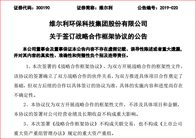 2019年3月18日,維爾利環(huán)保科技集團(tuán)股份有限公司(簡稱“維爾利環(huán)保”)發(fā)布公告稱,公司近期與常高新集團(tuán)有限公司(簡稱“常高新”)簽訂了《戰(zhàn)略合作框架協(xié)議》,共同深耕常州環(huán)保市場。 公告指出,本次合作將以項目、資本、技術(shù)、研發(fā)、產(chǎn)品、綜合金融服務(wù)為紐...