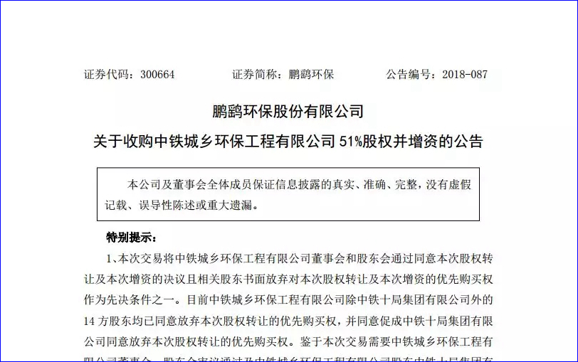 11月19日,鵬鷂環(huán)保股份有限公司開了第二屆董事會第十八次會議,審議通過了《關(guān)于收購中鐵城鄉(xiāng)環(huán)保工程有限公司51%股權(quán)并增資的議案》,同意公司收購中鐵城鄉(xiāng)環(huán)保工程有限公司(以下簡稱“中鐵環(huán)保”或“標的公司”)51%股權(quán)并對其進行增資,其中股權(quán)轉(zhuǎn)讓價款4...